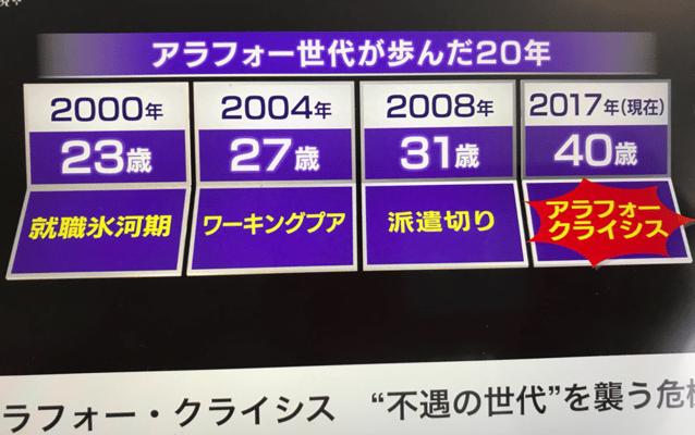 アラフォー世代は、不遇の世代だ。アラフォー世代が歩んだ20年を思い出すと、こんな感じだ。